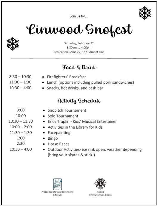 | 2026-02-07 | Linwood Lions Snofest All day event with Food and Drink, activities for the whole family! | 51W | Linwood & District Lions | Linwood Lions | linwood.obfuscated.a15lions@org | Snofest.jpg |