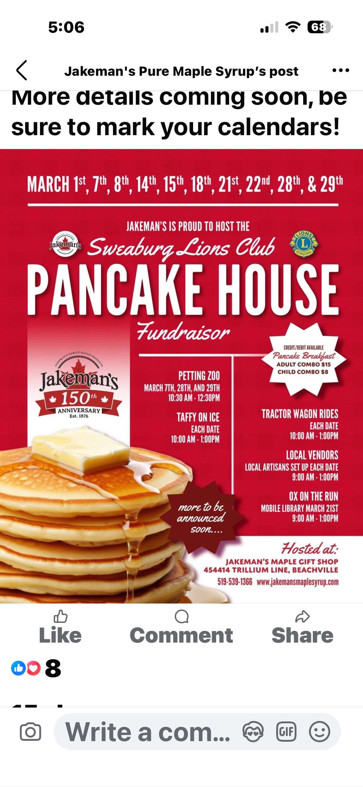 | 2026-03-01 | Pancake Breakfast Lions will be cooking and serving pancakes, sausages, baked beans, drinks, juice, coffee, and hot chocolate | 37S | Sweaburg & District Lions | Rick Bell | bellrick6.obfuscated.gmail@com | pancake.JPG |