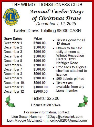 | 2025-12-01 | Christmas Draw Twelve Days of Christmas Draw. See flyer for more details. | 37S | Lions Club of Wilmot Lioness | Susan Hammer | 12days.obfuscated.execulink@com | Christmas_Draw.jpg |